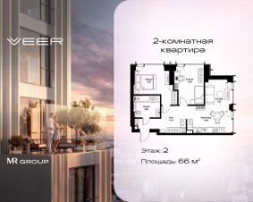 Продаётся 2-к квартира общей площадью 66 м² без отделки в ЖК VEER на 2-м этаже 59 этажного дома.