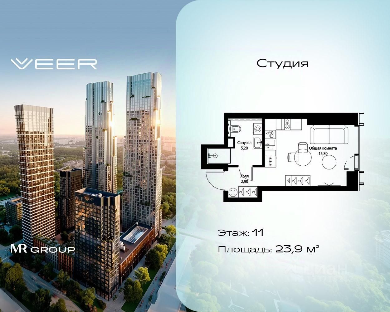 Продаётся студия общей площадью 23.90 м² с предчистовой отделкой в ЖК VEER на 11-м этаже 59 этажного дома.