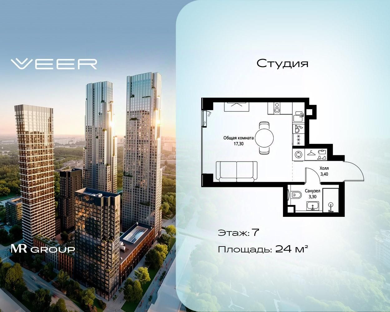 Продаётся студия общей площадью 24 м² с предчистовой отделкой в ЖК VEER на 7-м этаже 22 этажного дома.