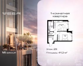Продаётся 1-к квартира общей площадью 41.20 м² без отделки в ЖК VEER на 29-м этаже 59 этажного дома.