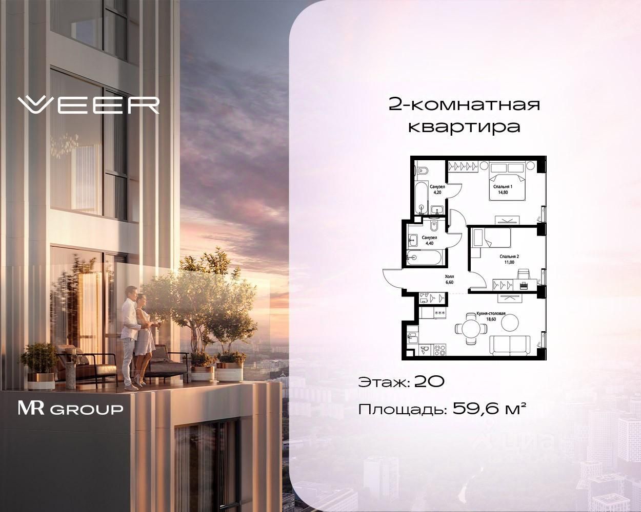 Продаётся 2-к квартира общей площадью 59.60 м² с предчистовой отделкой в ЖК VEER на 20-м этаже 22 этажного дома.