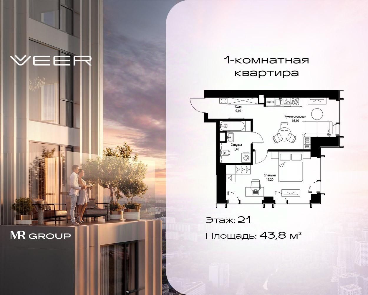 Продаётся 1-к квартира общей площадью 43.80 м² с предчистовой отделкой в ЖК VEER на 21-м этаже 59 этажного дома.