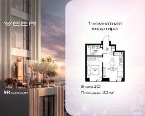 Продаётся 1-к квартира общей площадью 32 м² с предчистовой отделкой в ЖК VEER на 20-м этаже 46 этажного дома.