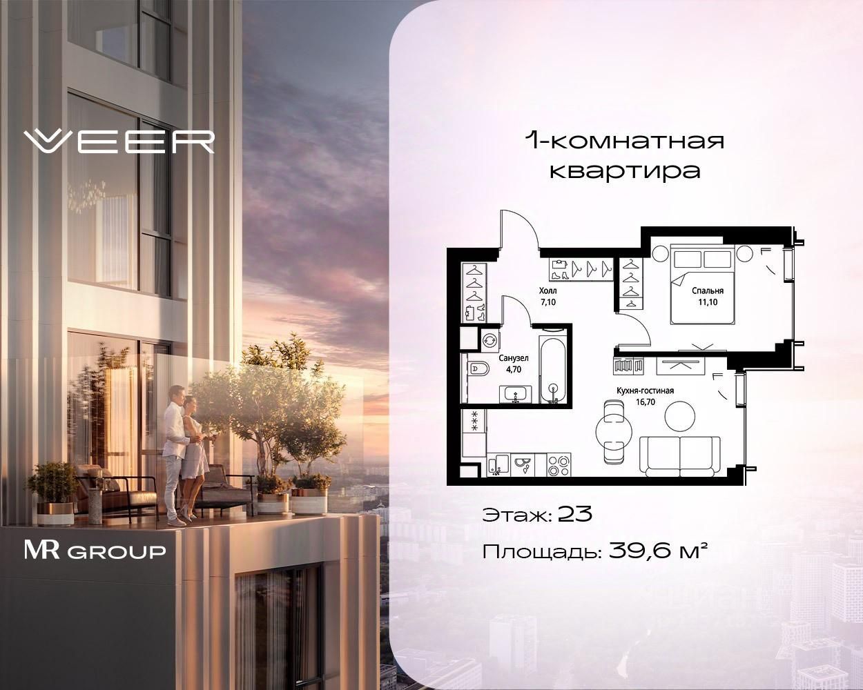 Продаётся 1-к квартира общей площадью 39.60 м² без отделки в ЖК VEER на 23-м этаже 59 этажного дома.