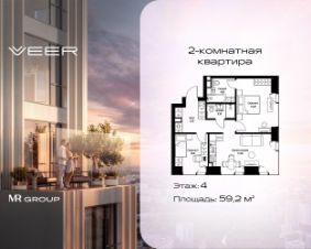 Продаётся 2-к квартира общей площадью 59.20 м² с предчистовой отделкой в ЖК VEER на 4-м этаже 46 этажного дома.