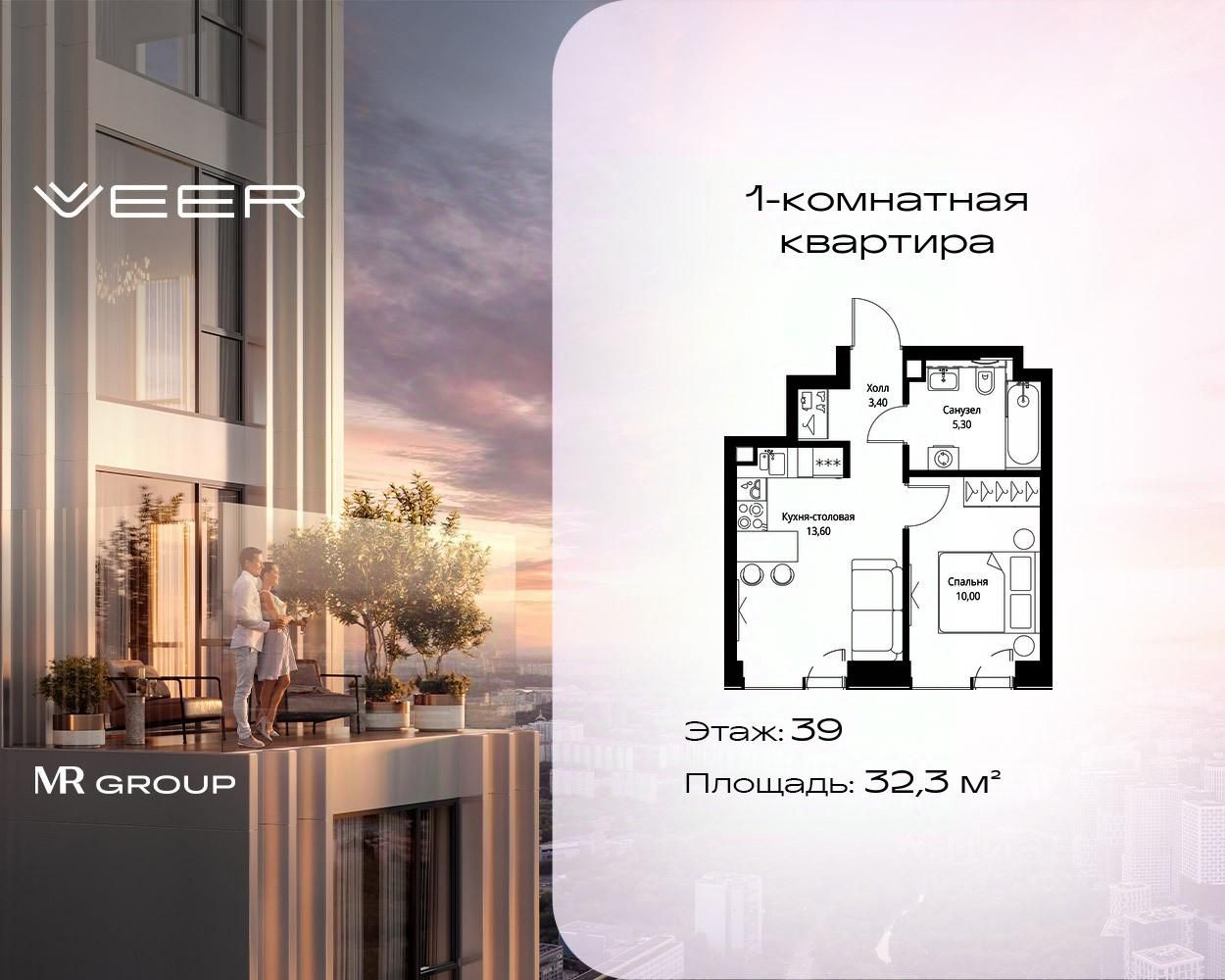 Продаётся 1-к квартира общей площадью 32.30 м² с предчистовой отделкой в ЖК VEER на 39-м этаже 46 этажного дома.