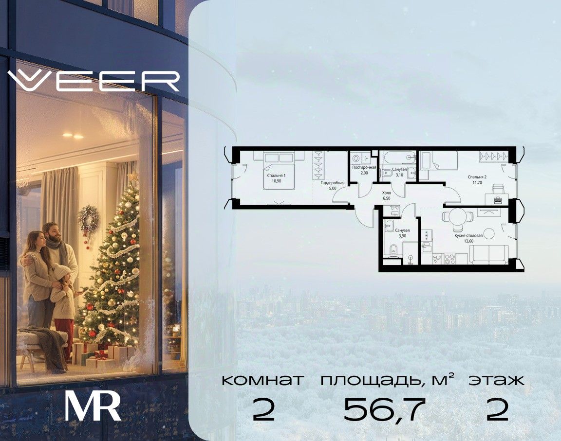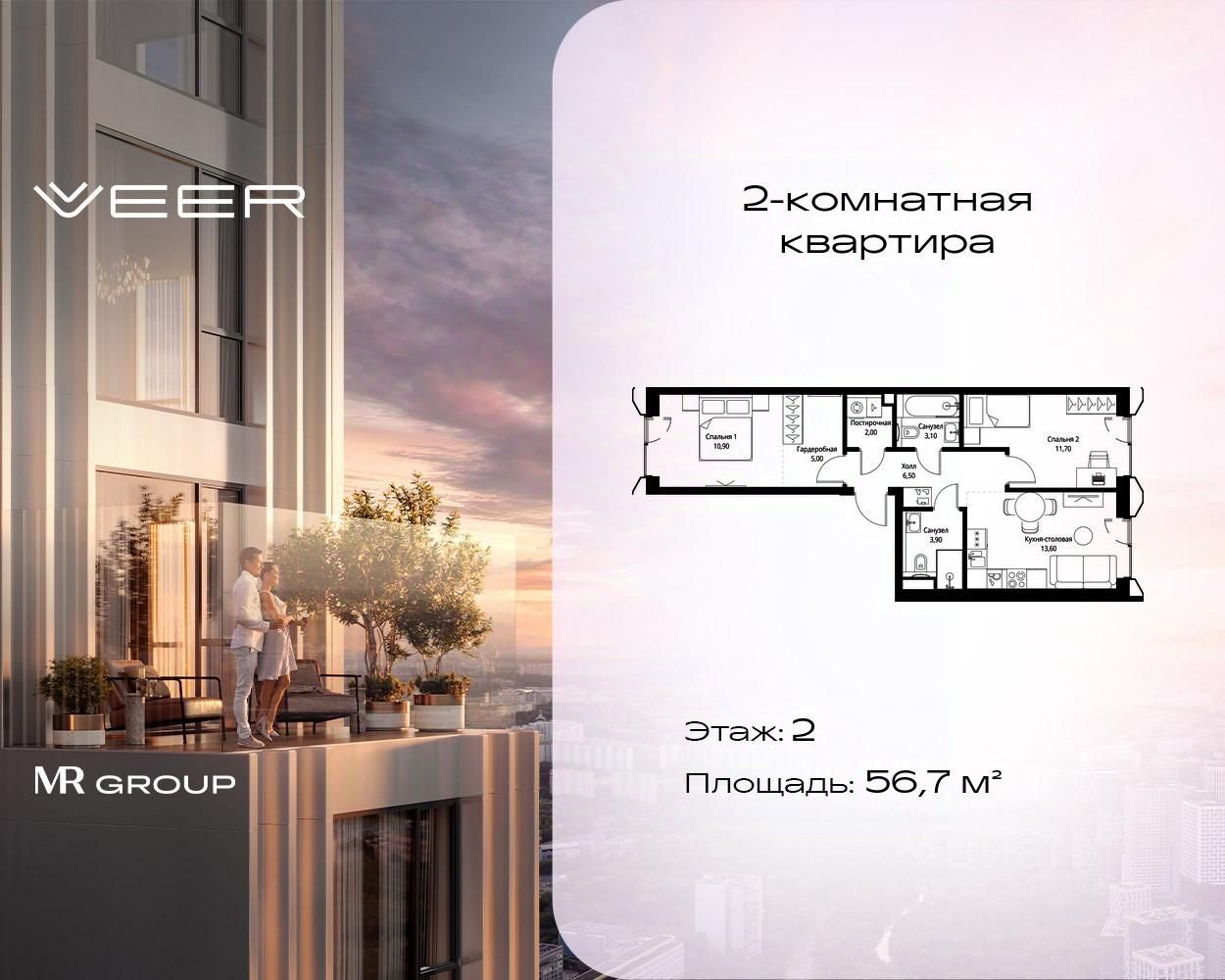 Продаётся 2-комнатная квартира общей площадью 56.70 м² с предчистовой отделкой в ЖК VEER на 2-м этаже 22 этажного дома.