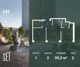 В ЖК SET продается 2-к квартира площадью 59.20 м², расположенная в корпусе 1, на 2 этаже 18 этажного дома.