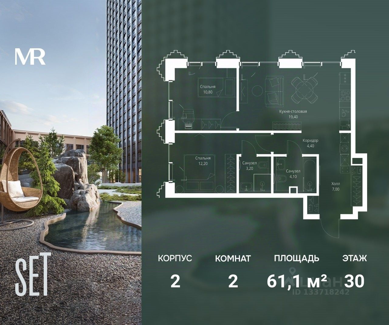 В ЖК SET продается 2-комнатная квартира площадью 61.10 м², расположенная в корпусе 2, на 30 этаже 59 этажного дома.