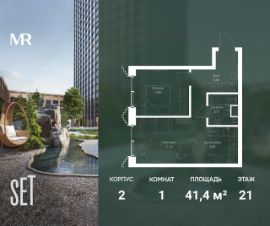 В ЖК SET продается 1-комнатная квартира площадью 41.40 м², расположенная в корпусе 2, на 21 этаже 59 этажного дома.