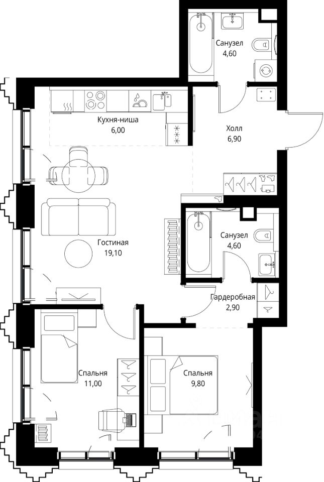 В ЖК SET продается 2-комнатная квартира площадью 64.90 м², расположенная в корпусе 2, на 20 этаже 59 этажного дома.