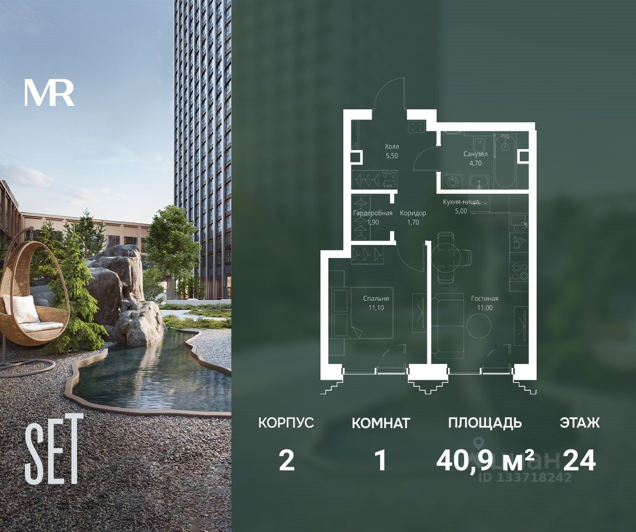 В ЖК SET продается 1-комнатная квартира площадью 40.90 м², расположенная в корпусе 2, на 24 этаже 59 этажного дома.