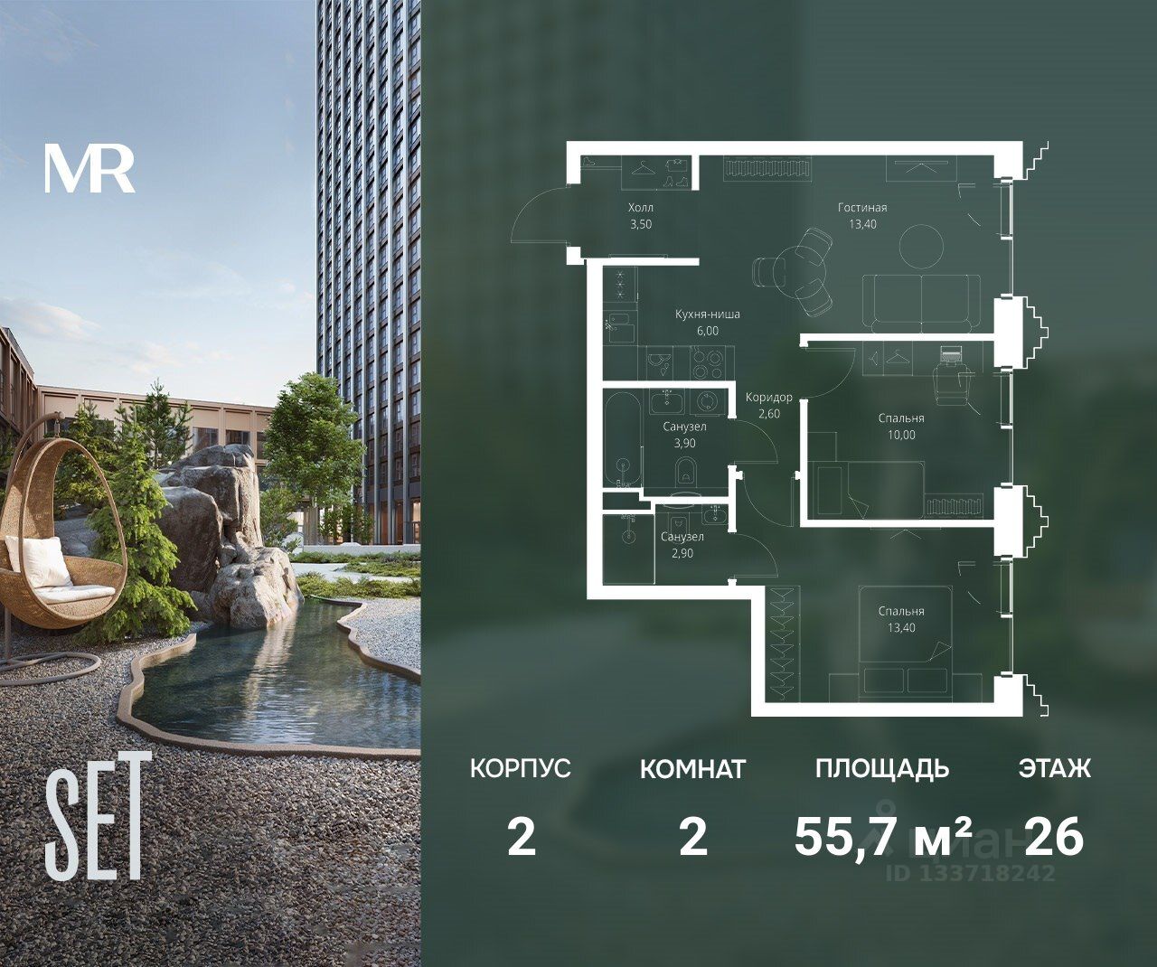 В ЖК SET продается 2-к квартира площадью 55.70 м², расположенная в корпусе 2, на 26 этаже 59 этажного дома.