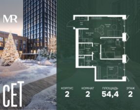 В ЖК Сет продается 2-комнатная квартира площадью 54.40 м², расположенная в корпусе 2, на 2 этаже 59 этажного дома.