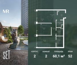 В ЖК SET продается 2-к квартира площадью 60.10 м², расположенная в корпусе 2, на 52 этаже 59 этажного дома.