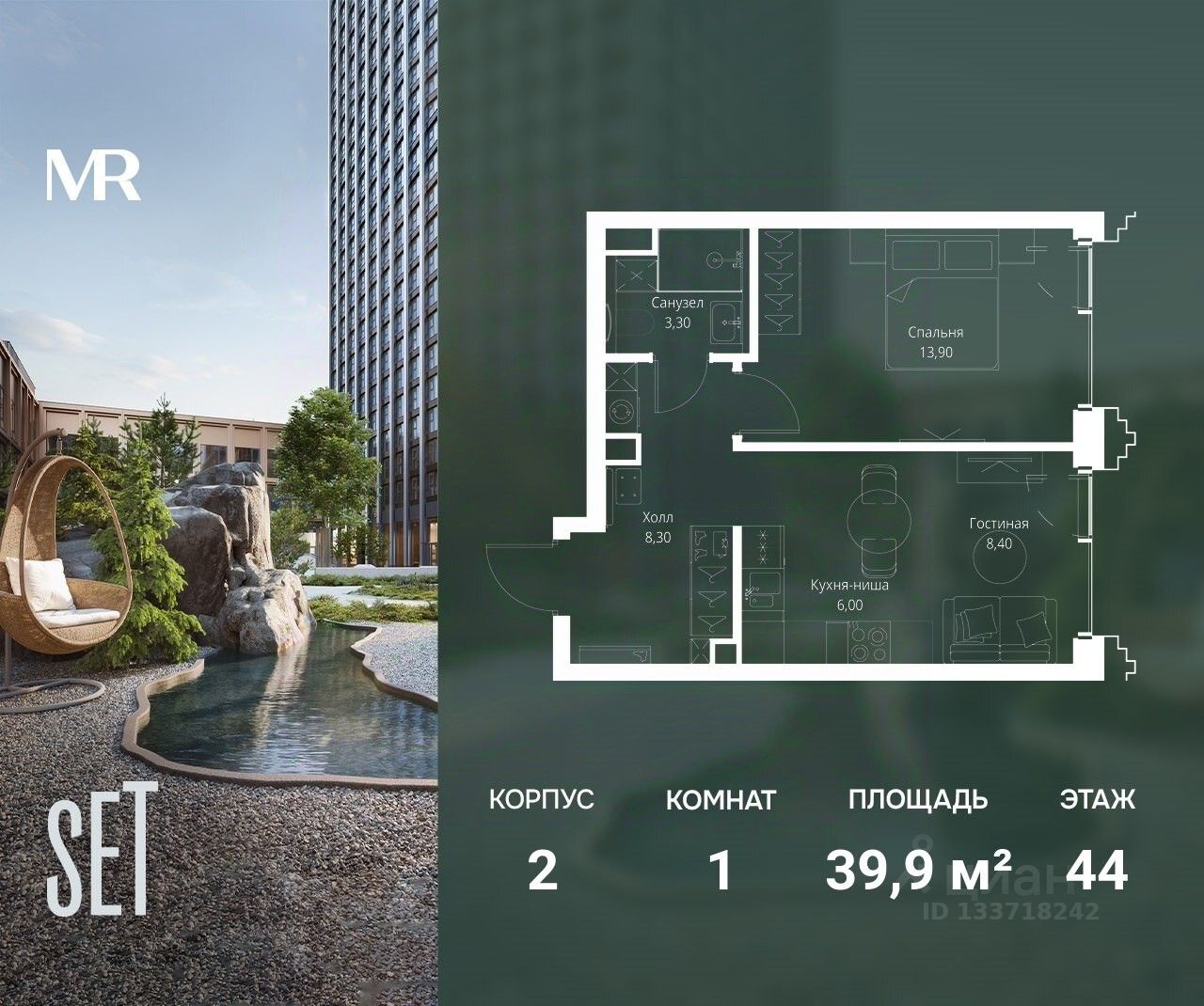 В ЖК SET продается 1-комнатная квартира площадью 39.90 м², расположенная в корпусе 2, на 44 этаже 59 этажного дома.