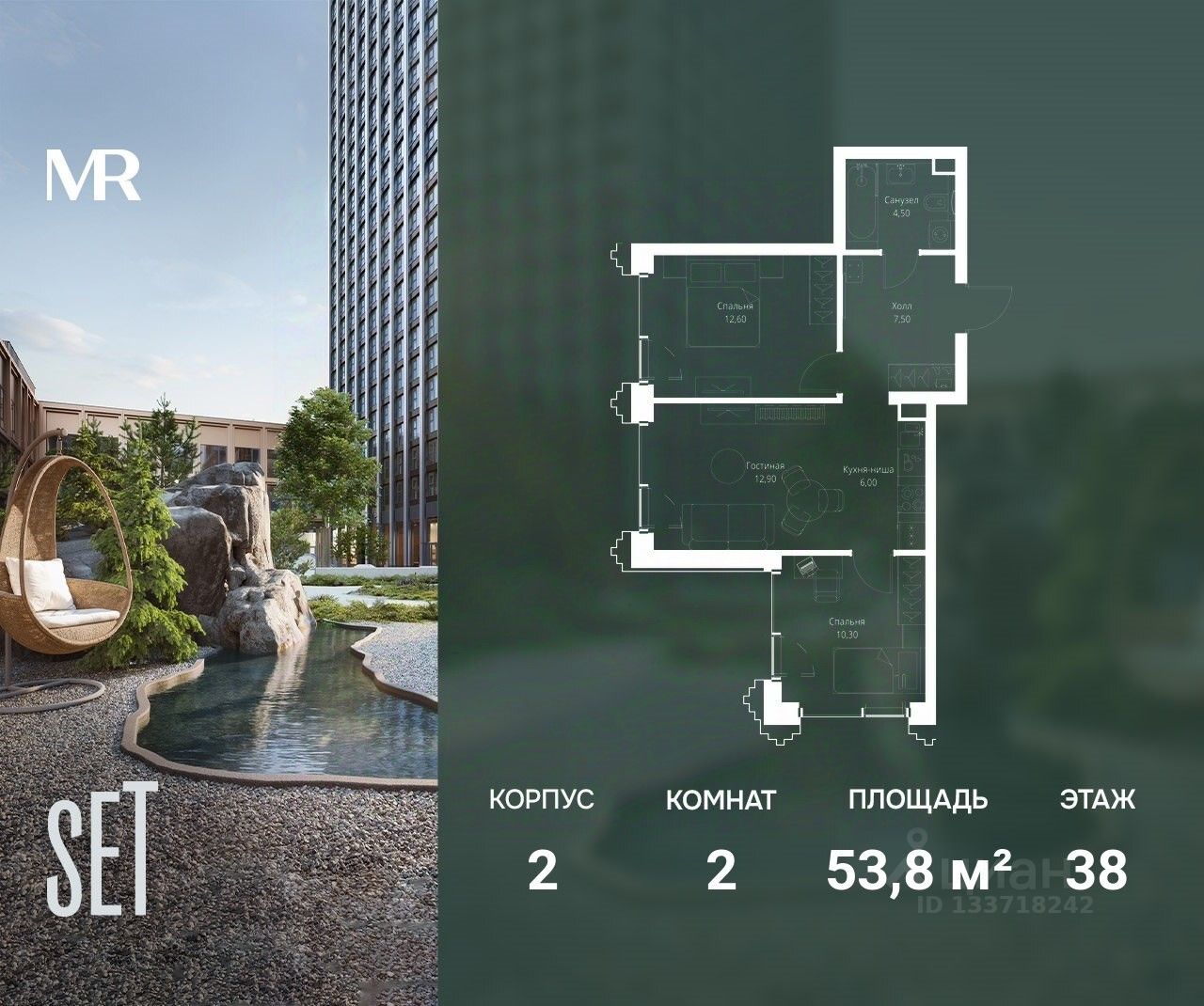 В ЖК SET продается 2-комнатная квартира площадью 53.80 м², расположенная в корпусе 2, на 38 этаже 59 этажного дома.