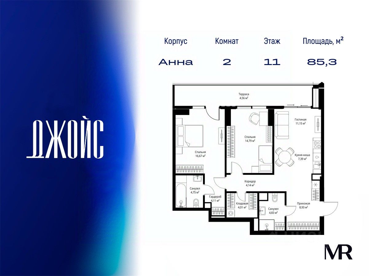 В продаже квартира площадью 85.33 м² без отделки на 11 этаже 55 этажного дома. Квартира расположена в корпусе Анна.