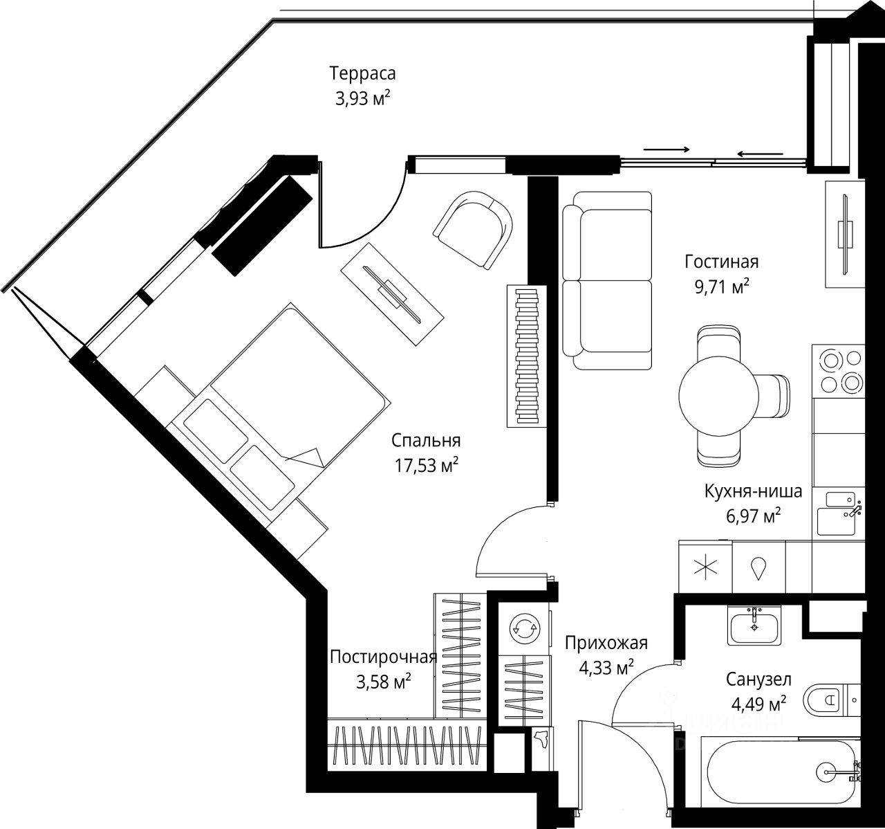 В продаже квартира площадью 50.54 м² без отделки на 17 этаже 55 этажного дома. Квартира расположена в корпусе Anna.