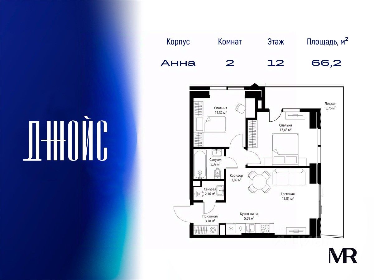 В продаже квартира площадью 66.23 м² с предчистовой отделкой на 12 этаже 55 этажного дома. Квартира расположена в корпусе Анна.