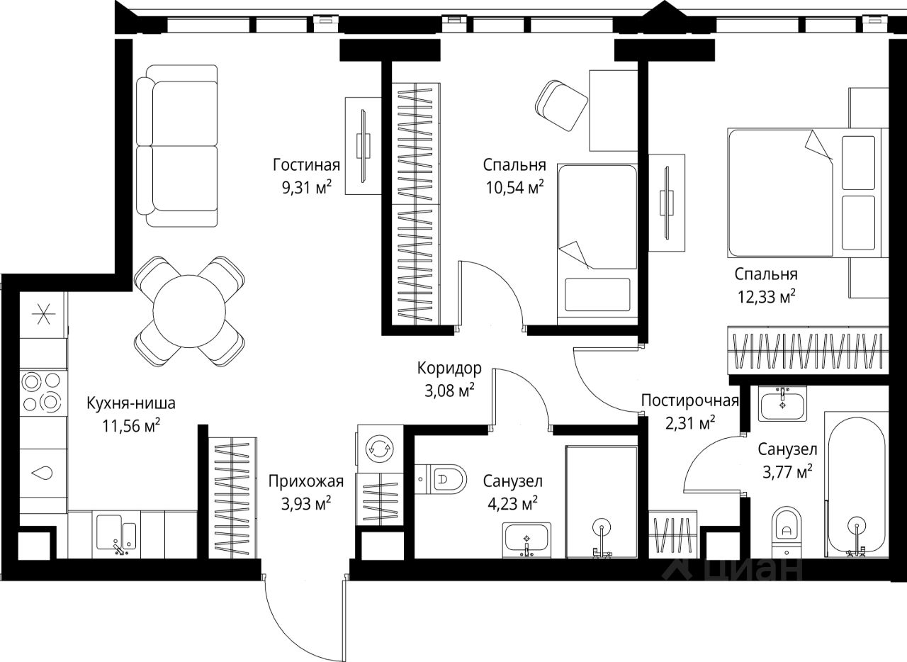 В продаже квартира площадью 61.06 м² с предчистовой отделкой на 54 этаже 55 этажного дома. Квартира расположена в корпусе Anna.