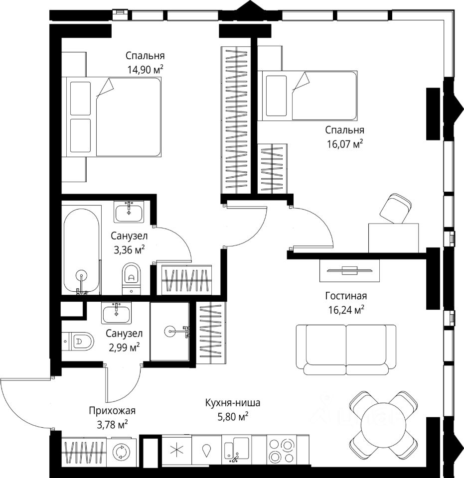В продаже квартира площадью 63.14 м² с предчистовой отделкой на 50 этаже 55 этажного дома. Квартира расположена в корпусе Anna.