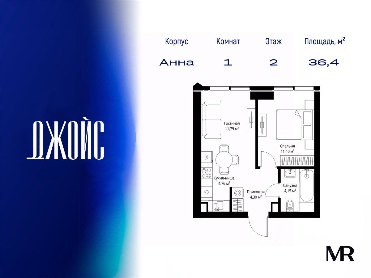 В продаже квартира площадью 36.40 м² с предчистовой отделкой на 2 этаже 55 этажного дома. Квартира расположена в корпусе Анна.