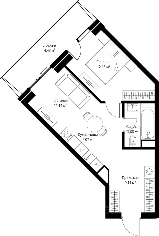 В продаже квартира площадью 46.99 м² без отделки на 8 этаже 46 этажного дома. Квартира расположена в корпусе Leo.