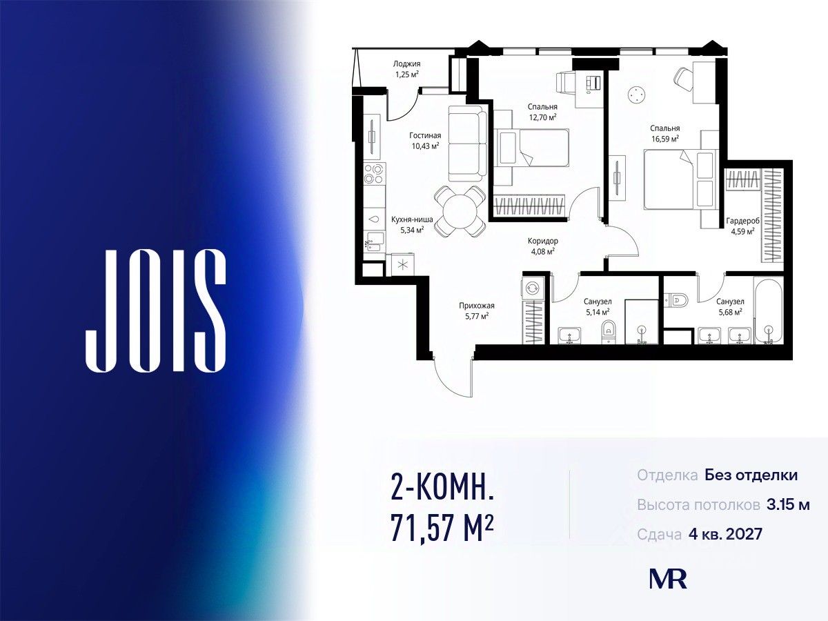 В продаже квартира площадью 71.57 м² без отделки на 13 этаже 46 этажного дома. Квартира расположена в корпусе Leo.