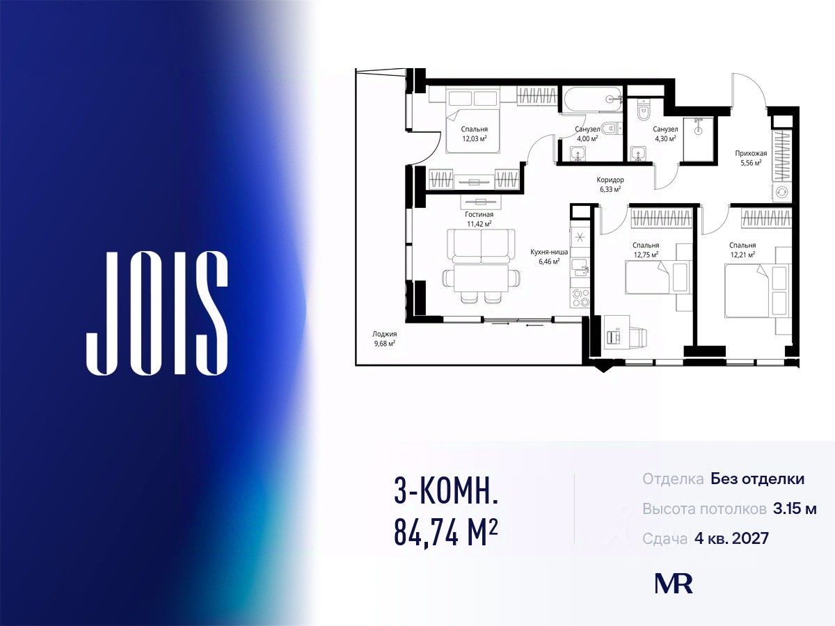 В продаже квартира площадью 84.74 м² без отделки на 13 этаже 46 этажного дома. Квартира расположена в корпусе Leo.