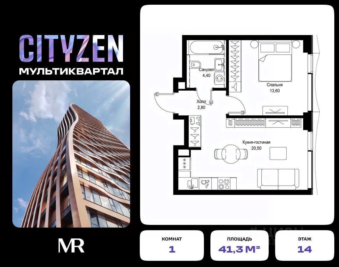 Продается 1-комнатная квартира от застройщика в жилом мультиквартале CITYZEN на 14-м этаже в корпусе #9 урбан-блока VOLNA. Общая площадь лота составляет 41.30 м²