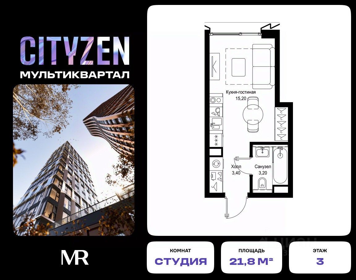 Продается студия от застройщика в жилом мультиквартале CITYZEN на 3-м этаже в корпусе #9 урбан-блока VOLNA. Общая площадь лота составляет 21.80 м²