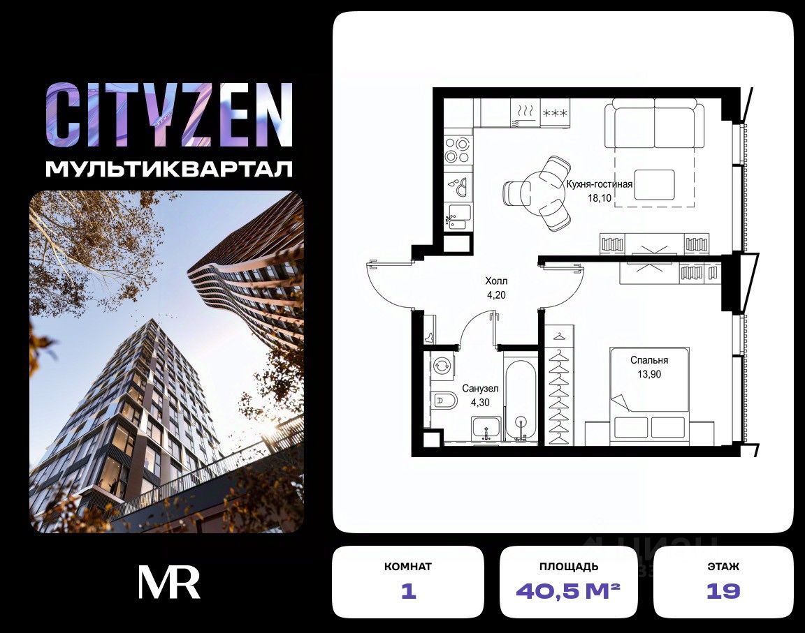 Продается 1-комнатная квартира от застройщика в жилом мультиквартале CITYZEN на 19-м этаже в корпусе #7 урбан-блока VOLNA. Общая площадь лота составляет 40.50 м²