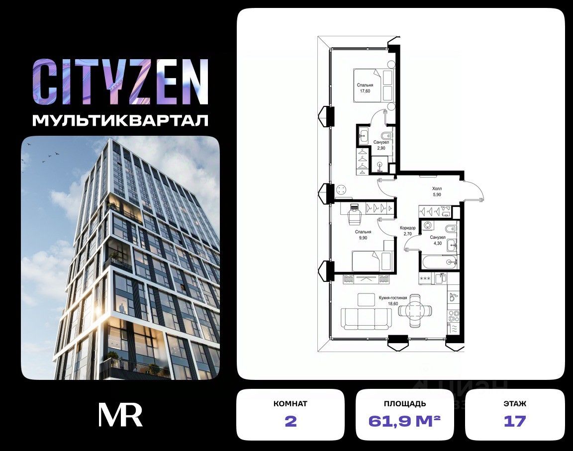 Продается 2-комнатная квартира от застройщика в жилом мультиквартале CITYZEN на 17-м этаже в корпусе #5 урбан-блока PARUS. Общая площадь лота составляет 61.90 м²