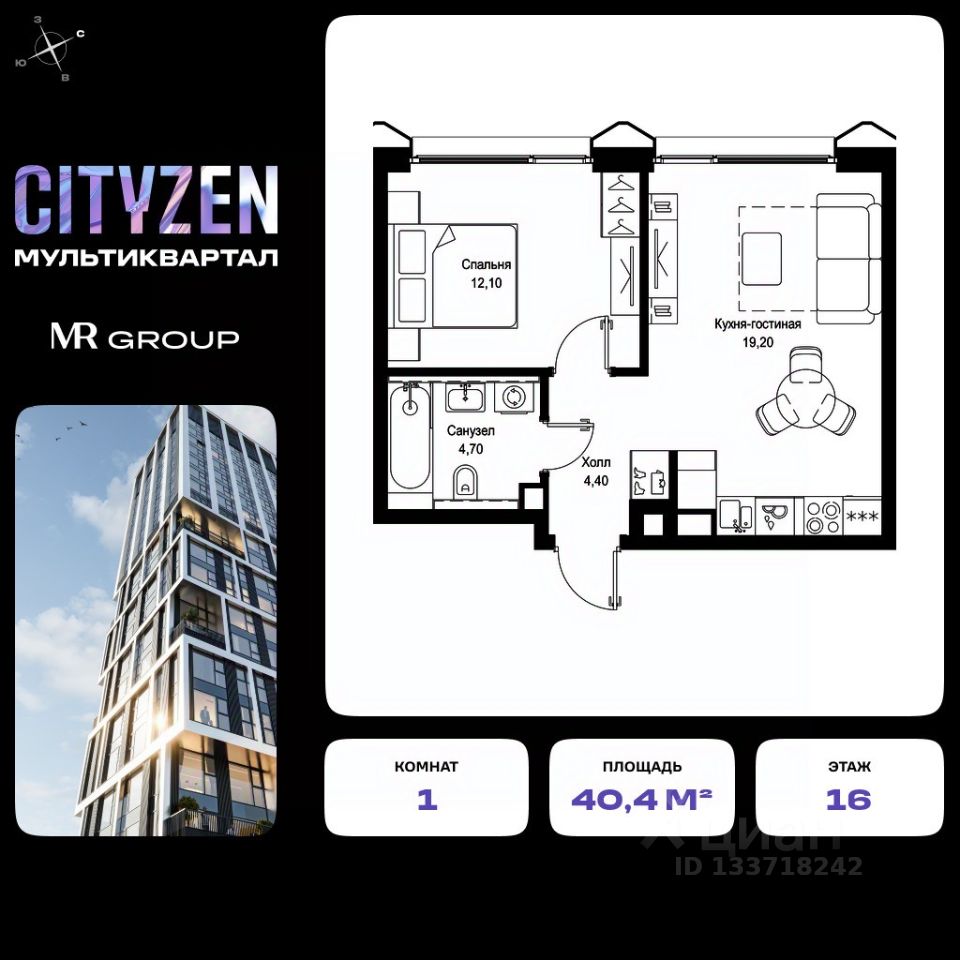 Продается 1-к квартира от застройщика в жилом мультиквартале CITYZEN на 16-м этаже в корпусе #5 урбан-блока PARUS. Общая площадь лота составляет 40.40 м²