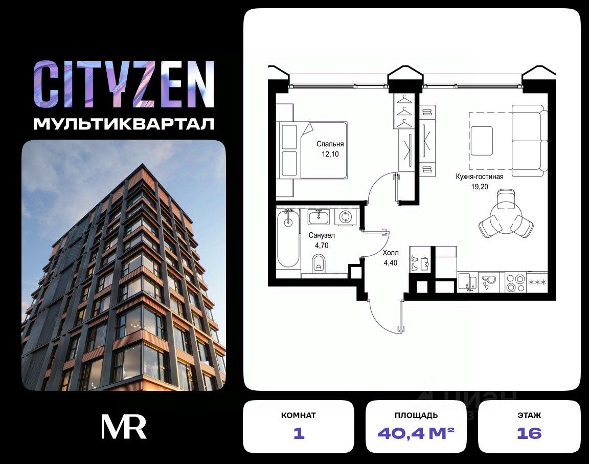 Продается 1-комнатная квартира от застройщика в жилом мультиквартале CITYZEN на 16-м этаже в корпусе #5 урбан-блока PARUS. Общая площадь лота составляет 40.40 м²