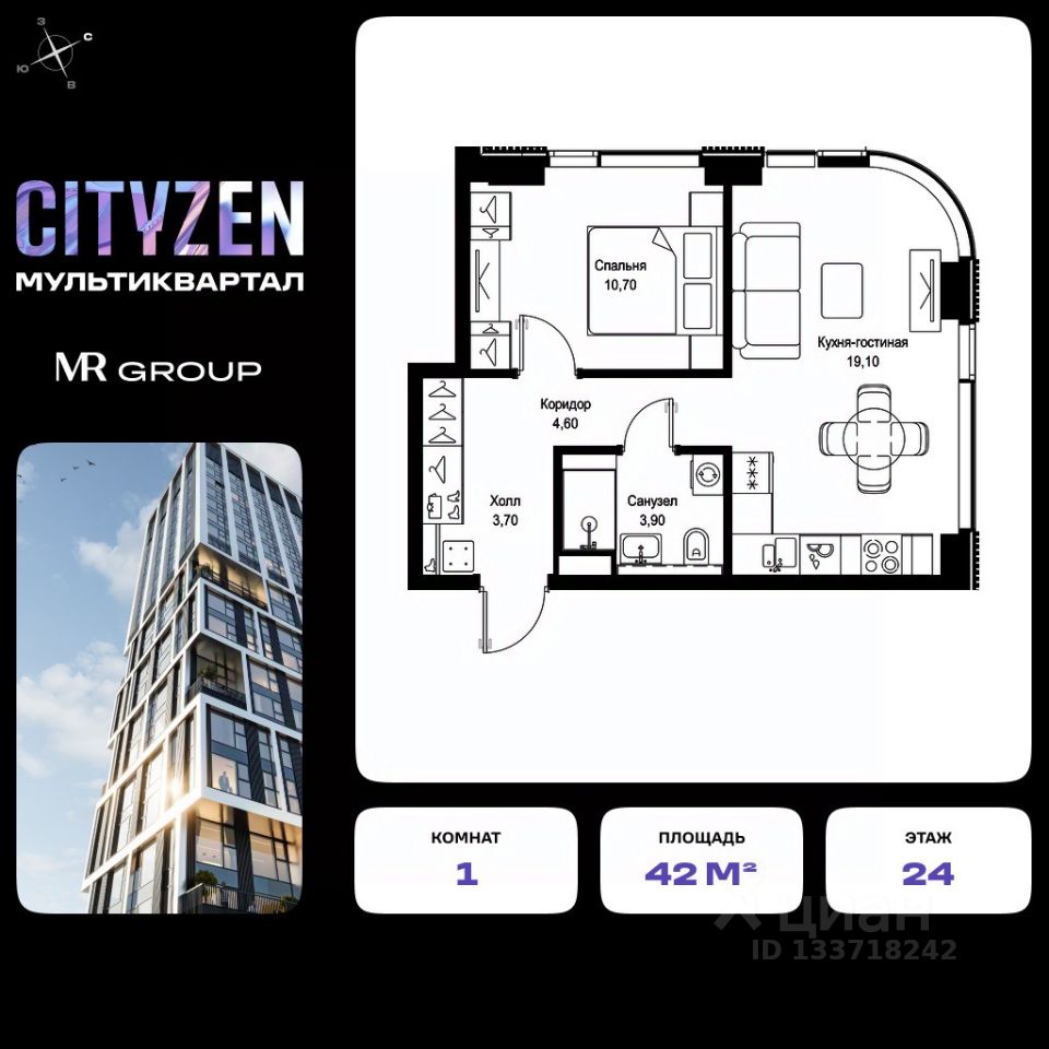 Продается 1-к квартира от застройщика в жилом мультиквартале CITYZEN на 24-м этаже в корпусе #1 урбан-блока PARUS. Общая площадь лота составляет 42 м²