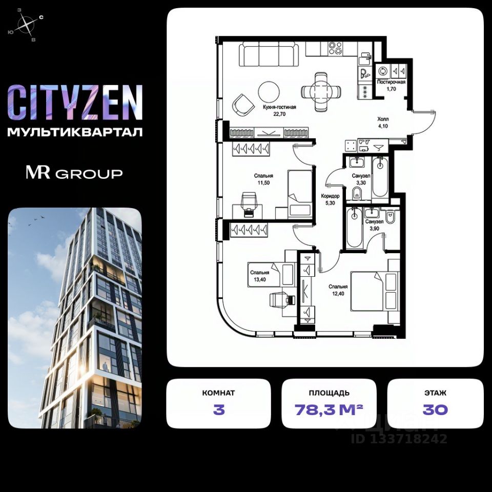 Продается 3-комнатная квартира от застройщика в жилом мультиквартале CITYZEN на 30-м этаже в корпусе #1 урбан-блока PARUS. Общая площадь лота составляет 78.30 м²