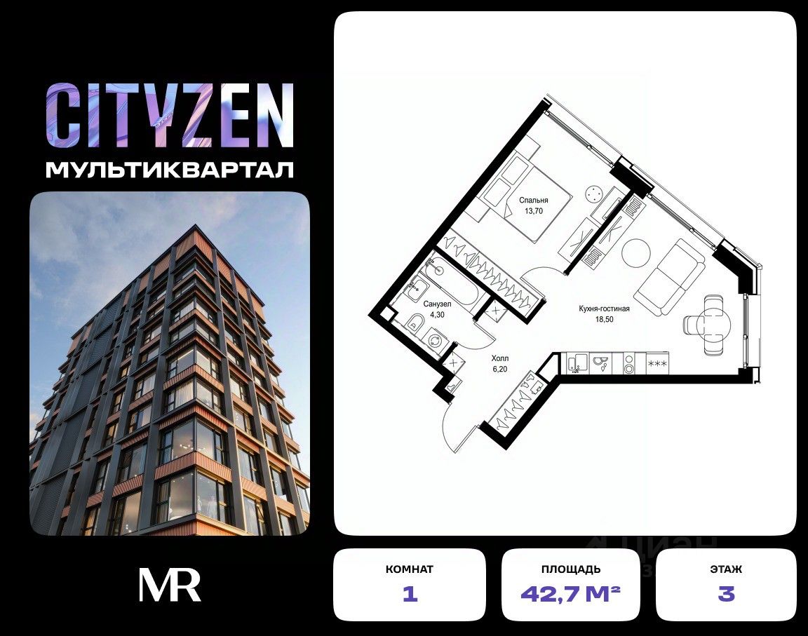 Продается 1-комнатная квартира от застройщика в жилом мультиквартале CITYZEN на 3-м этаже в корпусе #1 урбан-блока PARUS. Общая площадь лота составляет 42.70 м²