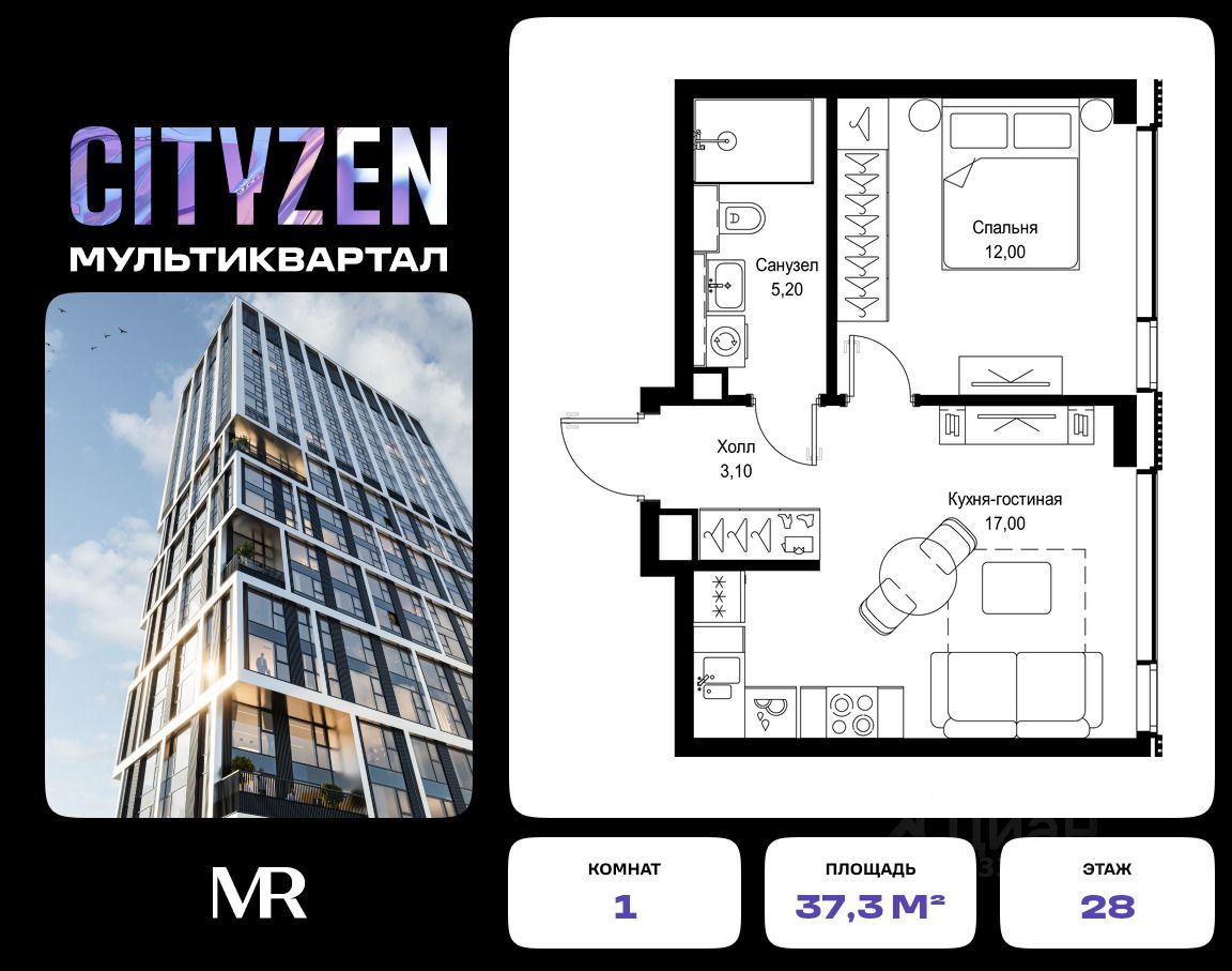 Продается 1-комнатная квартира от застройщика в жилом мультиквартале CITYZEN на 28-м этаже в корпусе #1 урбан-блока PARUS. Общая площадь лота составляет 37.30 м²