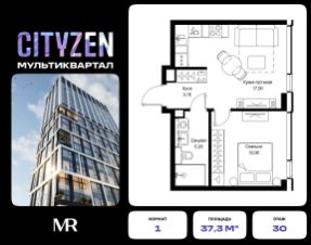 Продается 1-комнатная квартира от застройщика в жилом мультиквартале CITYZEN на 30-м этаже в корпусе #1 урбан-блока PARUS. Общая площадь лота составляет 37.30 м²