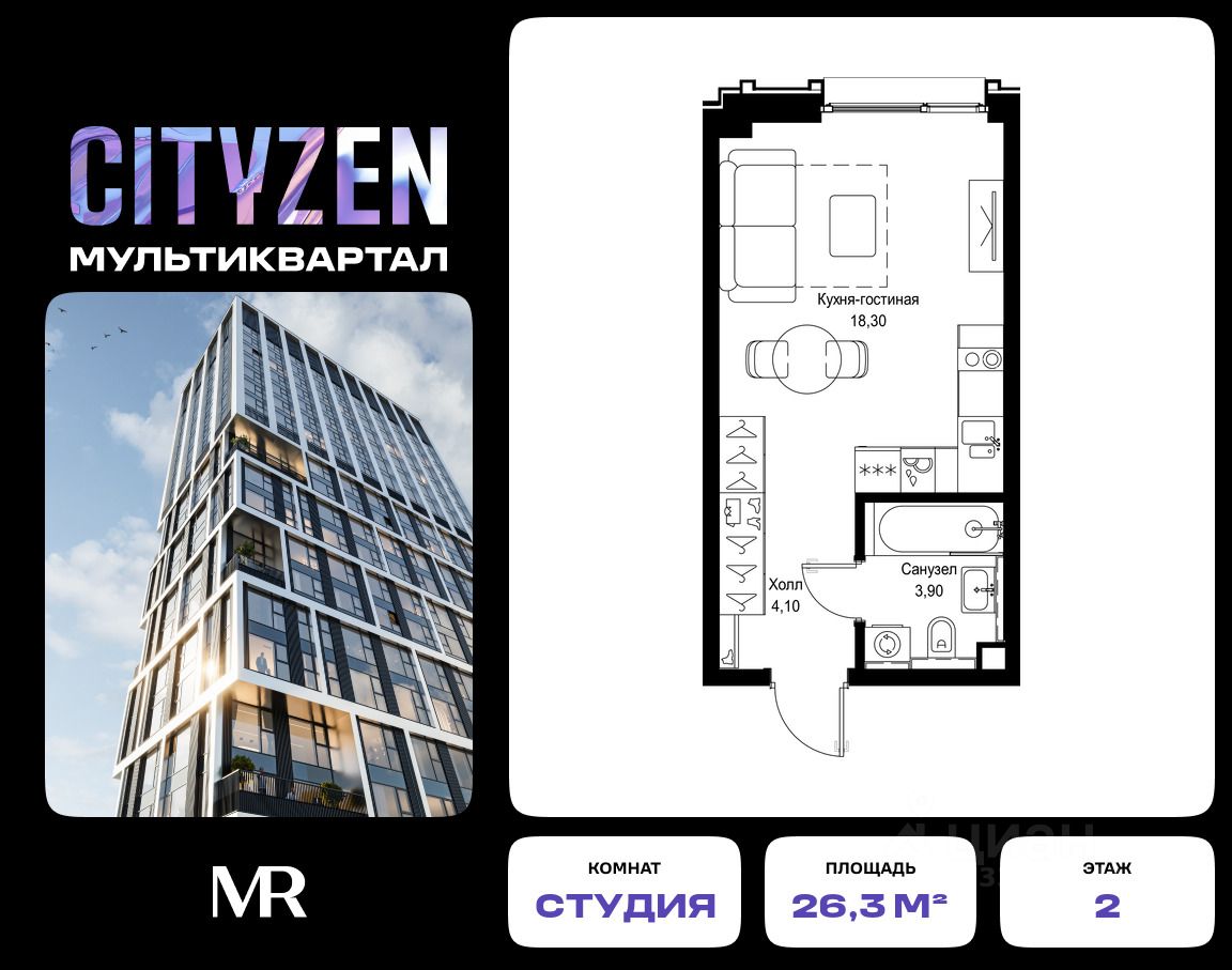 Продается студия от застройщика в жилом мультиквартале CITYZEN на 2-м этаже в корпусе #4 урбан-блока PARUS. Общая площадь лота составляет 26.30 м²