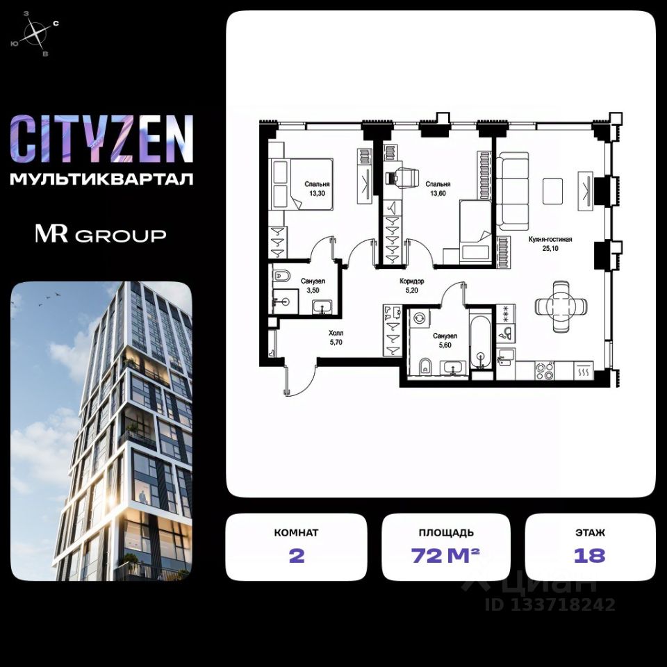 Продается 2-комнатная квартира от застройщика в жилом мультиквартале CITYZEN на 18-м этаже в корпусе #2 урбан-блока PARUS. Общая площадь лота составляет 72 м²