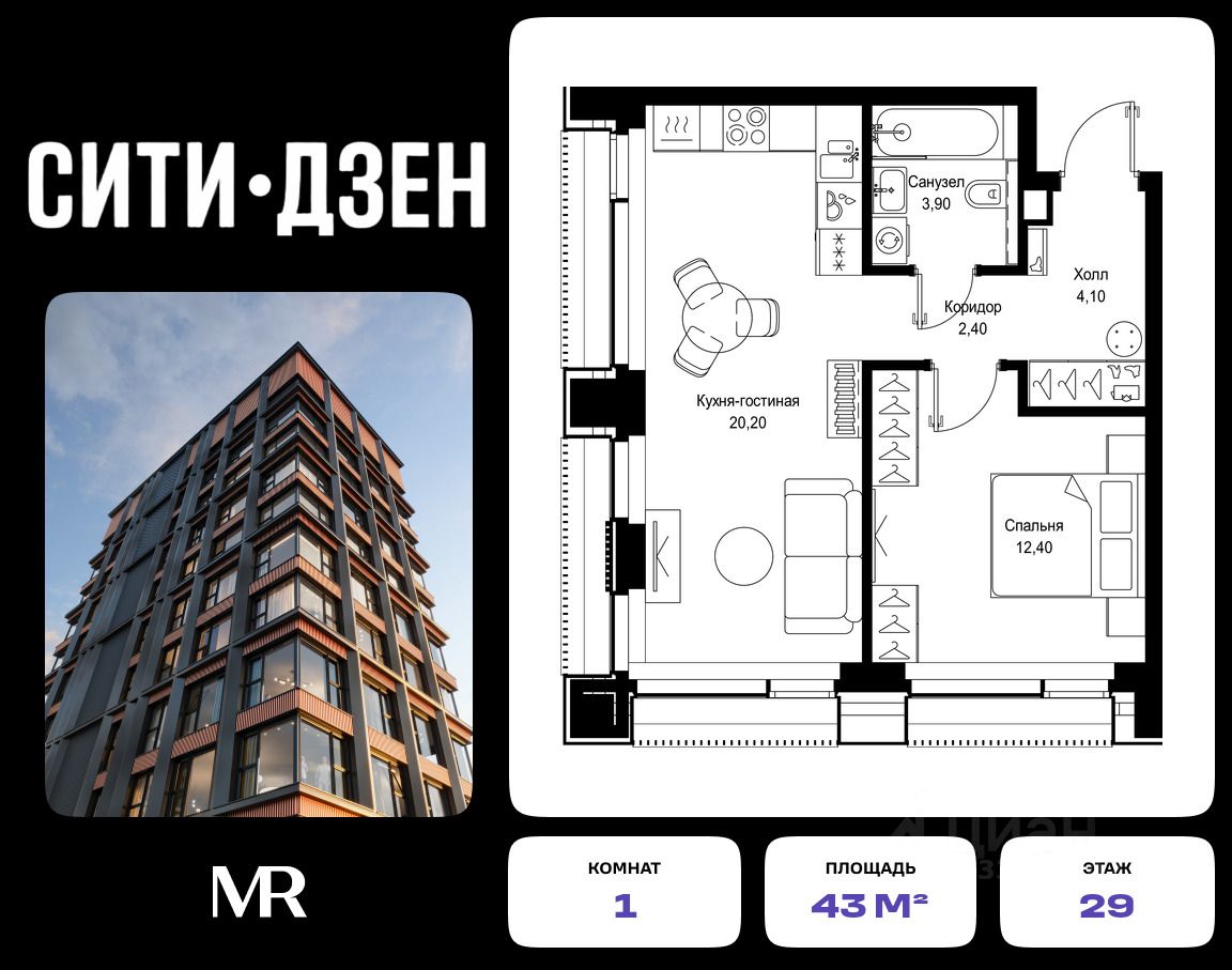 Продается 1-комнатная квартира от застройщика в жилом мультиквартале СИТИДЗЕН на 29-м этаже в корпусе #2. Общая площадь лота составляет 43 м²