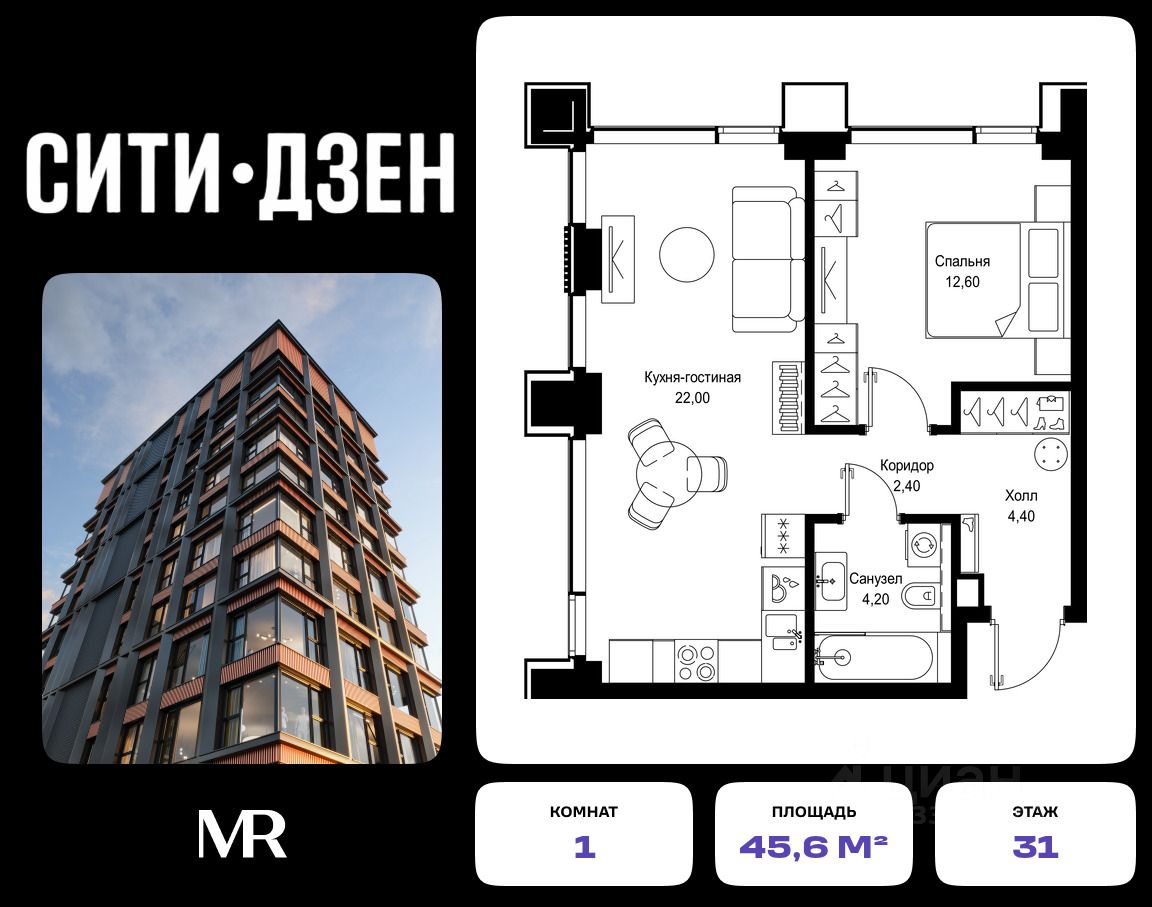 Продается 1-комнатная квартира от застройщика в жилом мультиквартале СИТИДЗЕН на 31-м этаже в корпусе #2 урбан-блока PARUS. Общая площадь лота составляет 45.60 м²