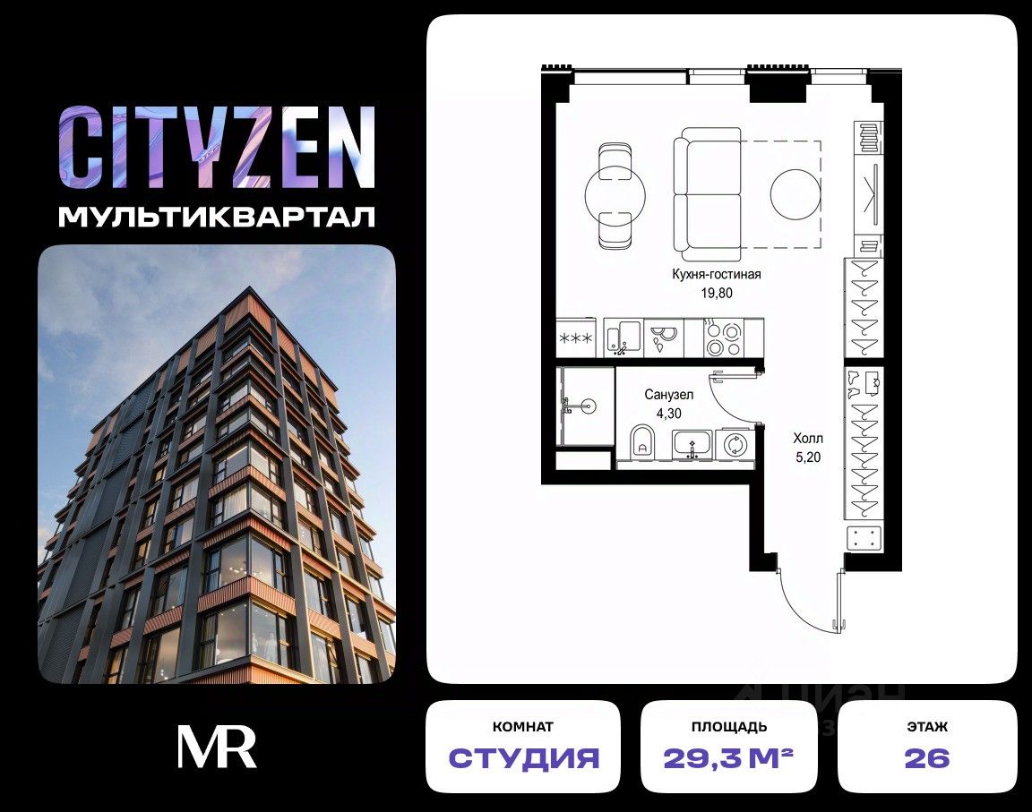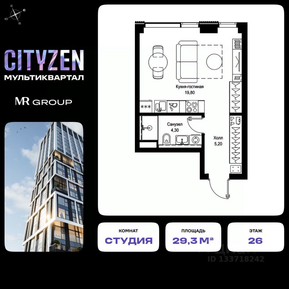 Продается студия от застройщика в жилом мультиквартале CITYZEN на 26-м этаже в корпусе #2 урбан-блока PARUS. Общая площадь лота составляет 29.30 м²