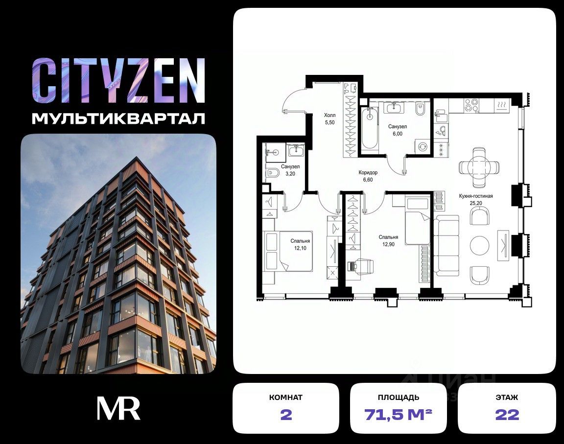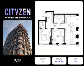 Продается 2-комнатная квартира от застройщика в жилом мультиквартале CITYZEN на 22-м этаже в корпусе #2 урбан-блока PARUS. Общая площадь лота составляет 71.50 м²