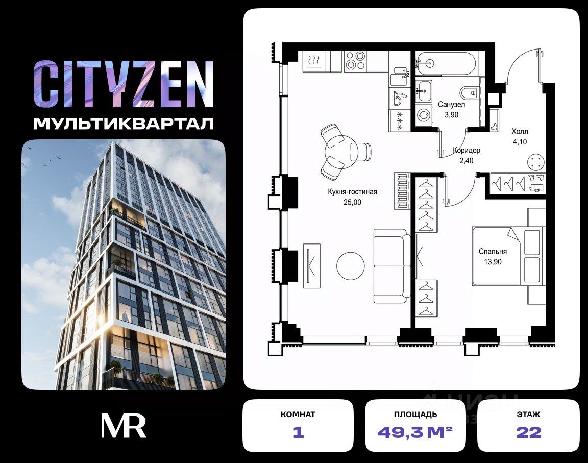 Продается 1-комнатная квартира от застройщика в жилом мультиквартале CITYZEN на 22-м этаже в корпусе #2 урбан-блока PARUS. Общая площадь лота составляет 49.30 м²