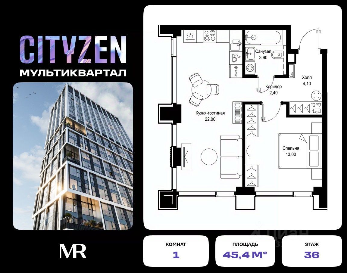 Продается 1-комнатная квартира от застройщика в жилом мультиквартале CITYZEN на 36-м этаже в корпусе #2 урбан-блока PARUS. Общая площадь лота составляет 45.40 м²