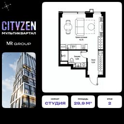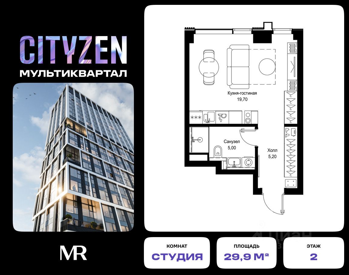 Продается студия от застройщика в жилом мультиквартале CITYZEN на 2-м этаже в корпусе #2 урбан-блока PARUS. Общая площадь лота составляет 29.90 м²